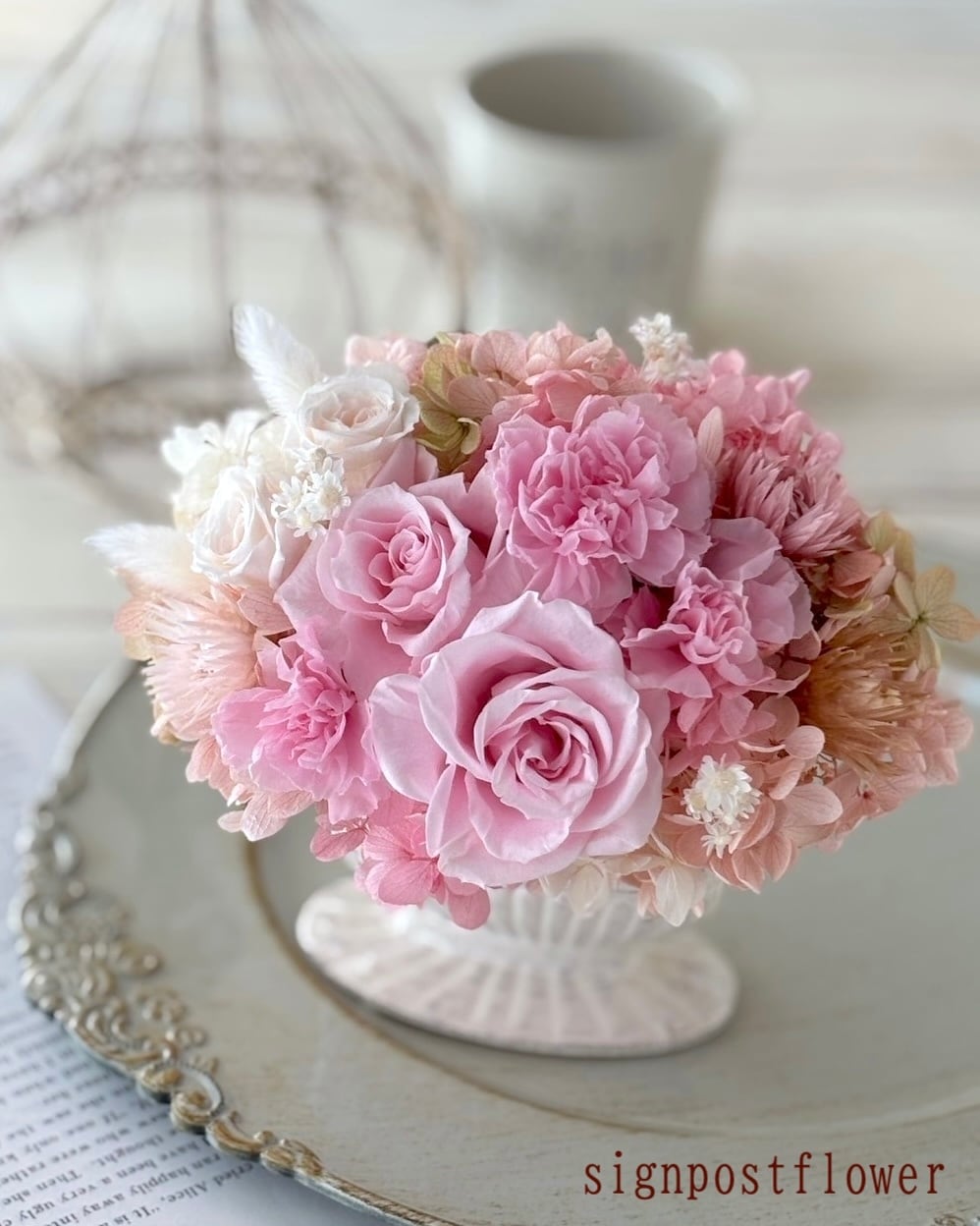 ふわっと愛されアレンジメント 癒し/ありがとうギフト/お母さん/ピンクアレンジメント/誕生日プレゼント/出産お祝い/プリザーブドフラワー/バラ/カーネーション