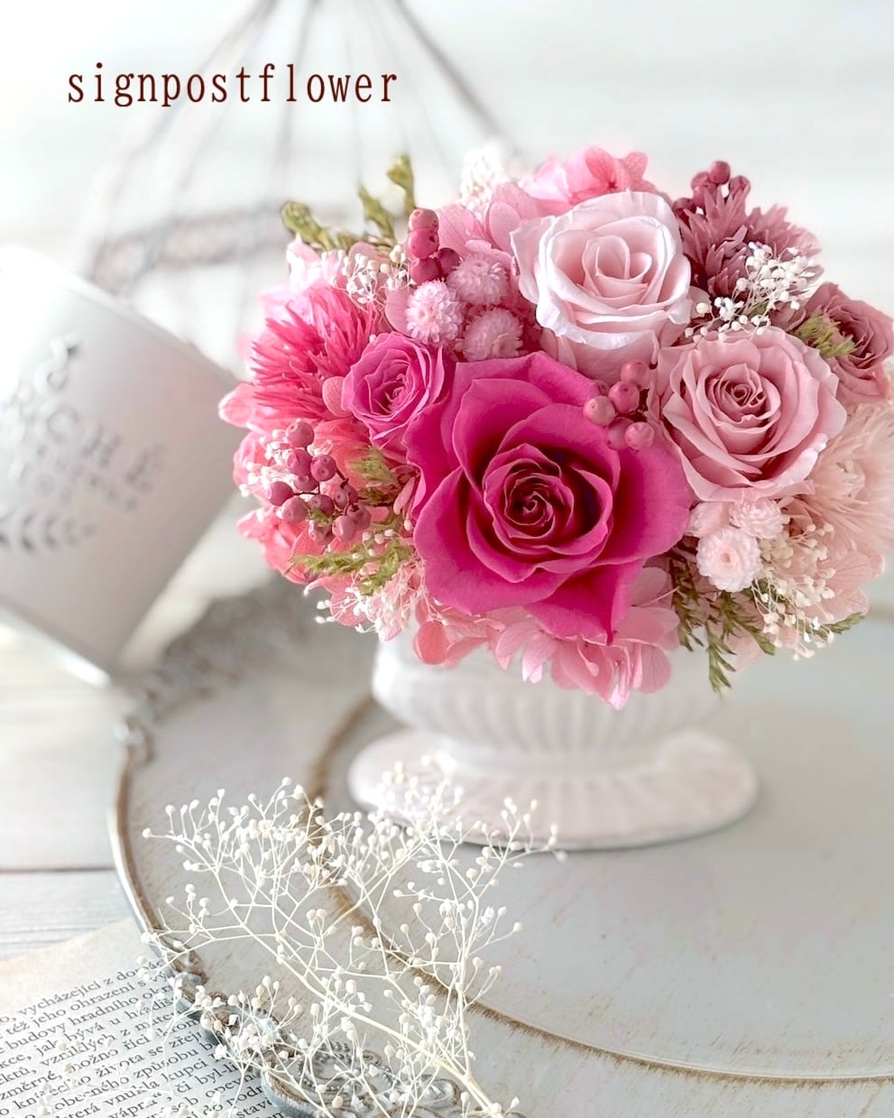 水をあげなくても長期間美しい姿を楽しめるのが贈り物として人気の一つですが、長い間、高温多湿、直射日光の場所に飾っておきますと、色が変わってしまったり、お花が傷んでしまいますのでお気をつけください。