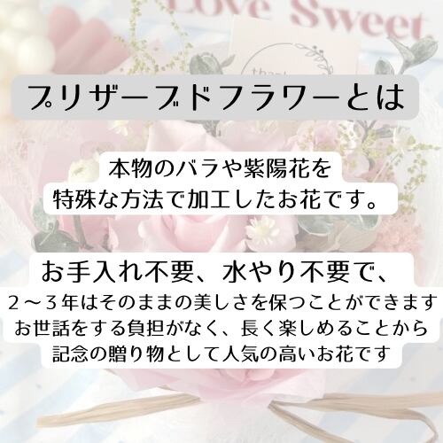 水をあげなくても長期間美しい姿を楽しめるのが贈り物として人気の一つですが、長い間、高温多湿、直射日光の場所に飾っておきますと、色が変わってしまったり、お花が傷んでしまいますのでお気をつけください。