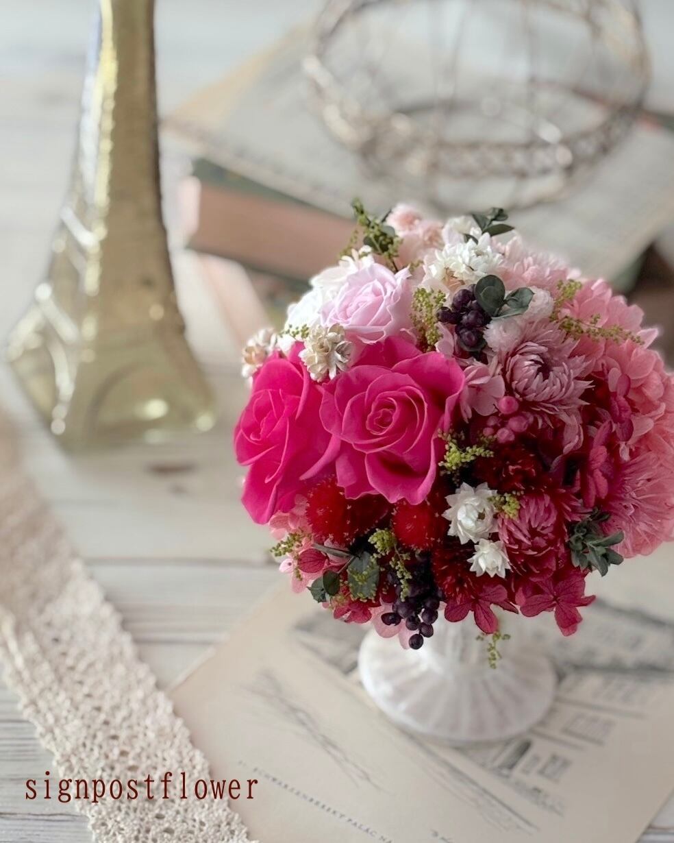 鮮やかなピンクバラをメインに使用した華やかで上品なアレンジメントです。