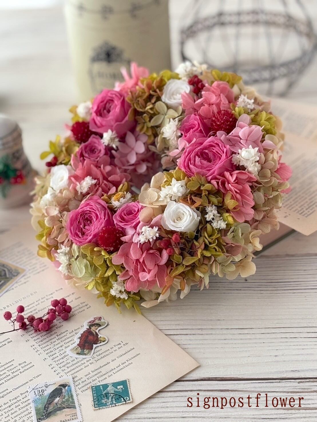 ◯使用花材 バラ、ミニバラ、アジサイ、ペッパーベリー、ストロベリーフィールド、スターフラワー、アンモビューム
